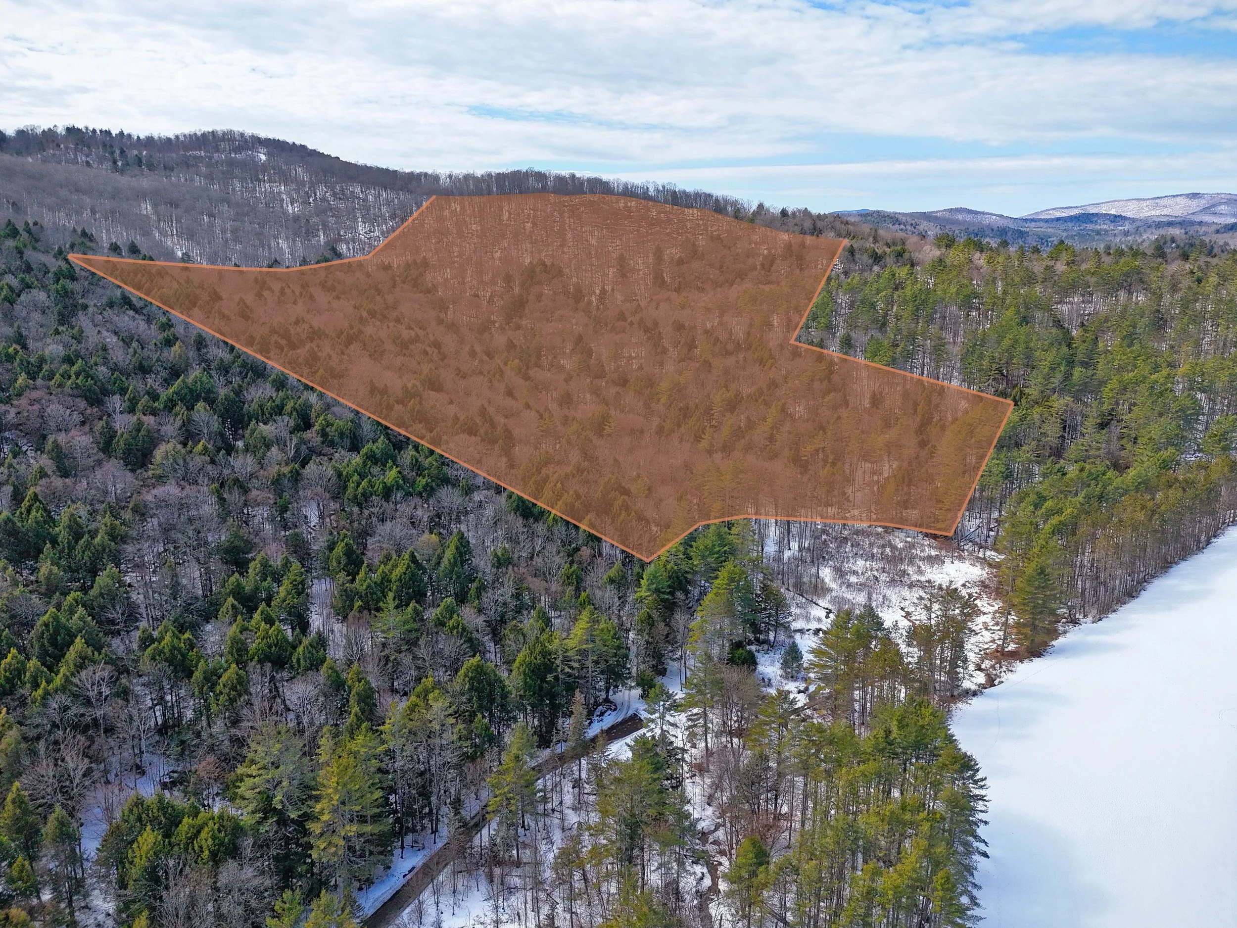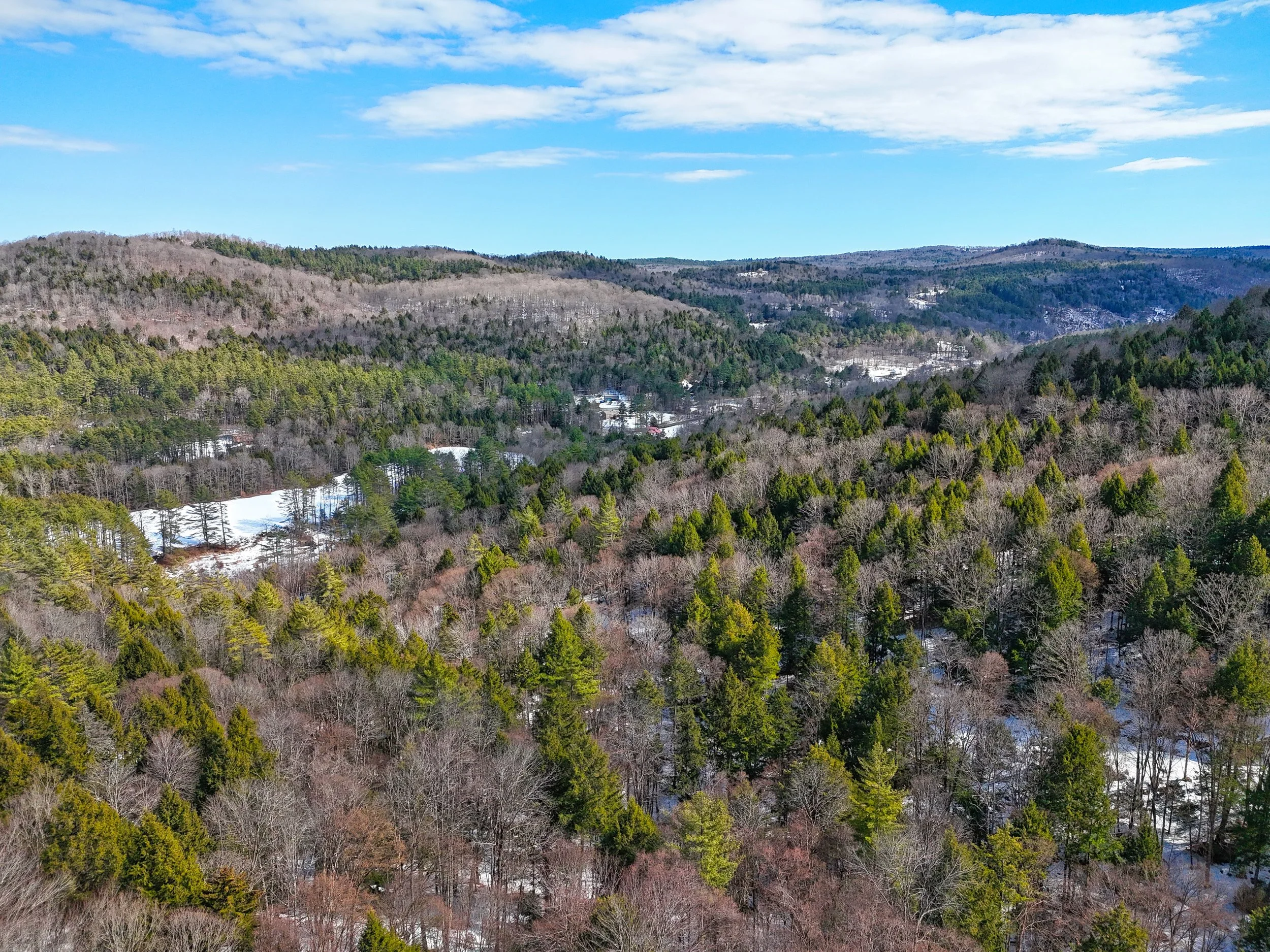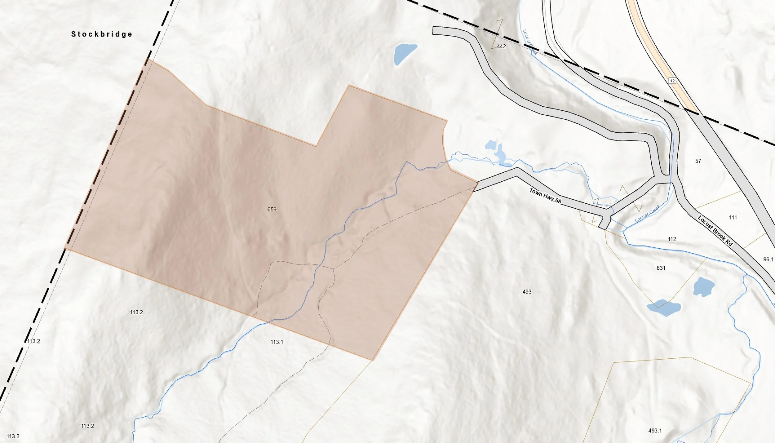 Large wooded parcel ascending two hillsides, with a creek-carved valley in the middle. The eastern side is easy to explore thanks to over 1,500 feet of dirt roads cut through the trees. The western side ascends to a summit with sparse tree cover and amazing scenic views. Beyond this the land continues up and over the ridge line then downhill once again to the Stockbridge town line.