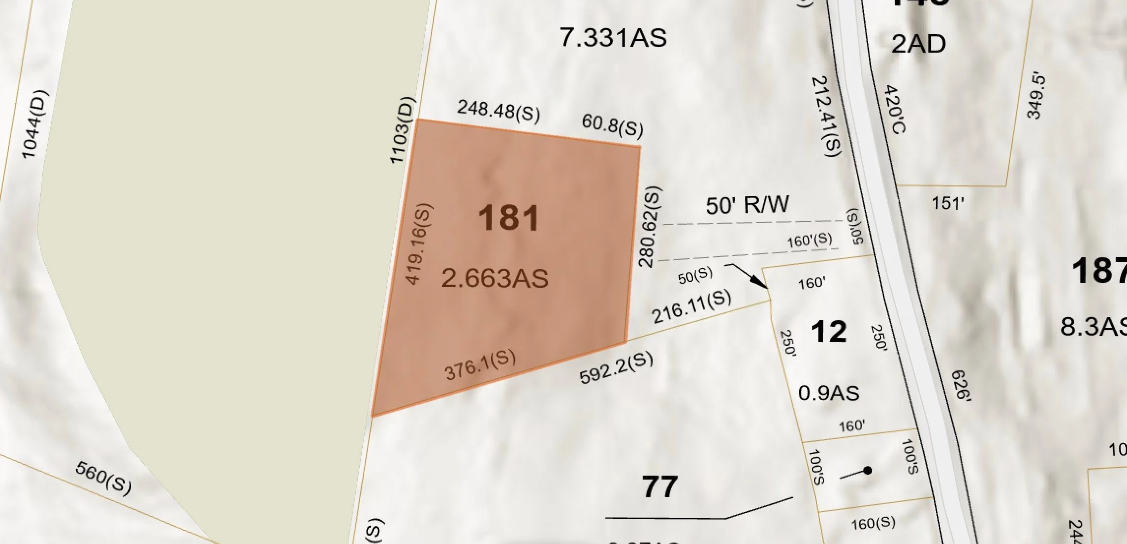 Access: 350-ft. long 50-ft. wide ROW from Pudding Hill Road.